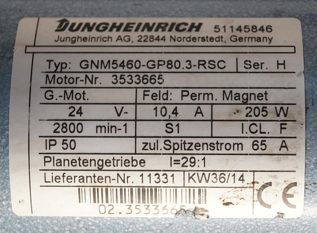 Jungheinrich 51145846 | Steeringmotor 24V type GNM5460 GP80,3 RSC Steering sensor 52037950 year 2014 motor nr. 3533665