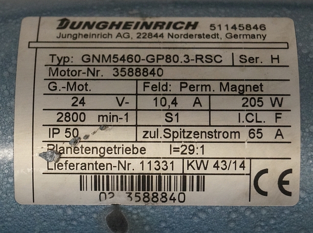 Jungheinrich 51145846 | Steeringmotor 24V type GNM5460 GP80,3 RSC Steering sensor 52037950 year 2014 motor nr. 3588840